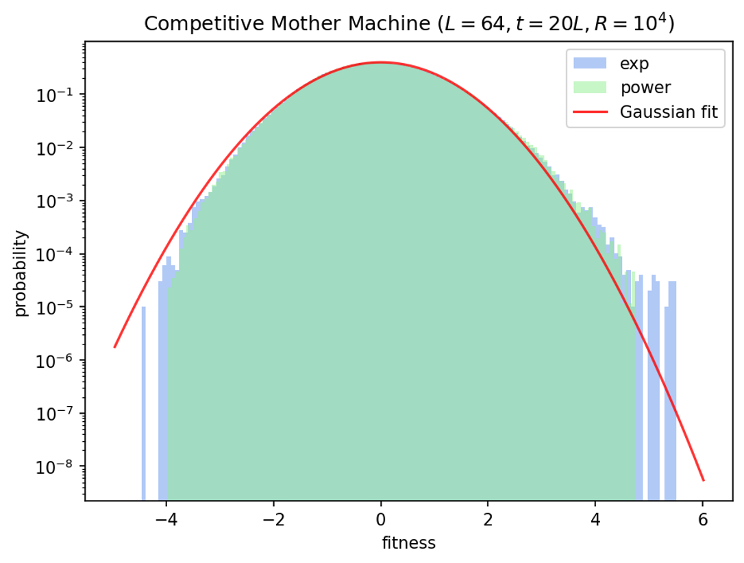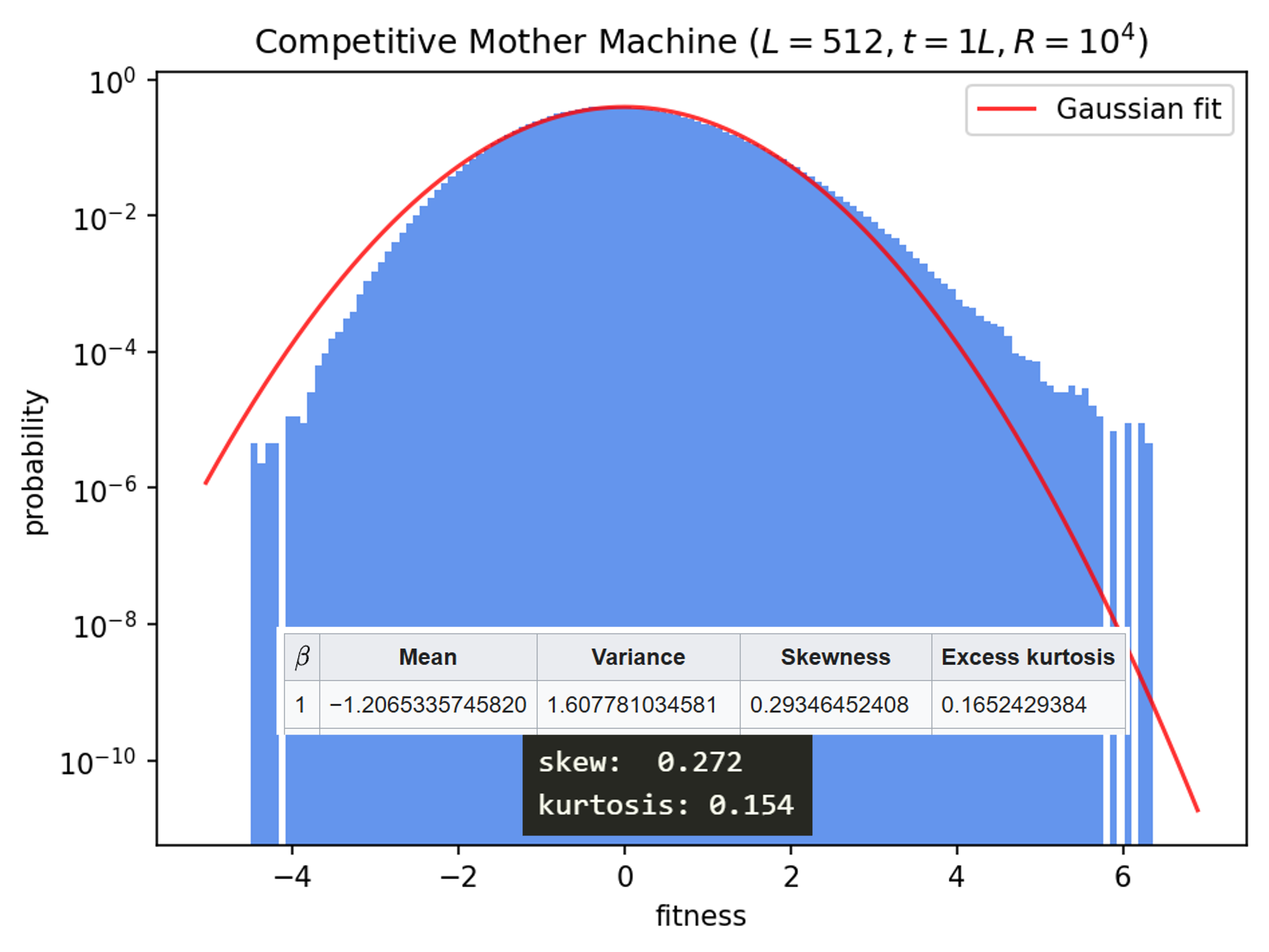 while the fitness distribution follows the (non-Gaussian) skewed Tracy-Widom distribution: