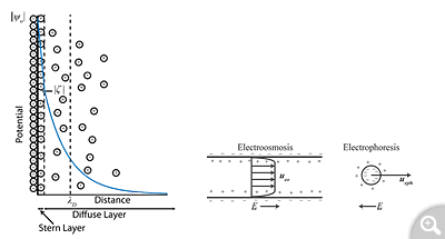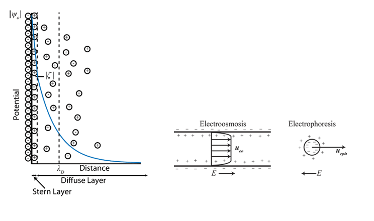 Many substances develop an electrical charge when in contact with an aqueous solution. This charged surface and the resulting charge distribution in the solution is known as the electrical double layer (EDL). DC electric fields exert coulombic forces on the EDL and can result in particle translation (electrophoresis) or bulk liquid motion (electroosmosis).