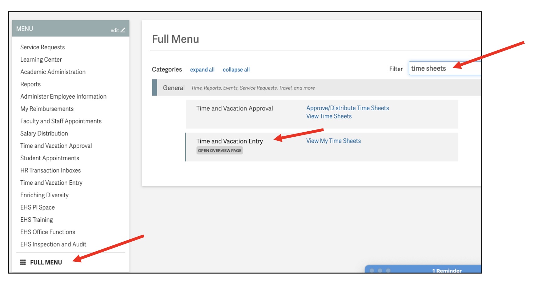 Timesheets are processed electronically in Atlas on a weekly basis. Employees should click on “Full Menu” then search for "Time and Vacation Entry" on the Menu tab to enter time each week.