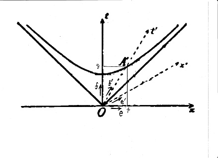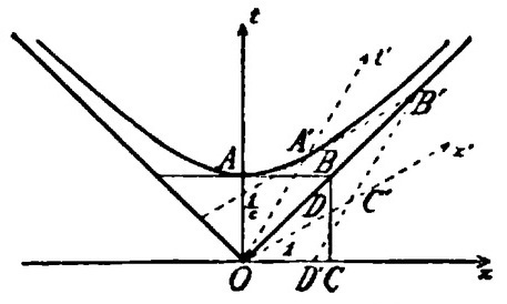 "If we then take OC′ and OA′ as axes for parallel coordinates x′ and t′ with units OC′=1, OA′=1/c, then this branch of the hyperbola again has the equation