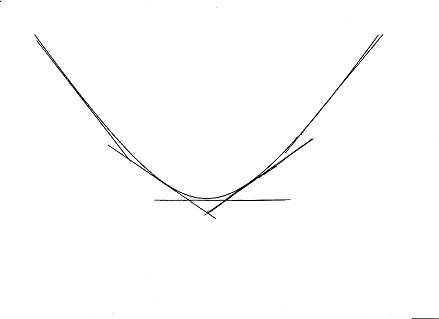 In the figure we see tangent lines to an hyperbola drawn at various points. Notice that at the far right, where both x and ct are very large and positive, they have slope 1, like the asymptote. At the far left, where x is a large negative number, but ct is again large and positive, the slope approaches −1. At the centre, where x is zero, the slope is also zero.