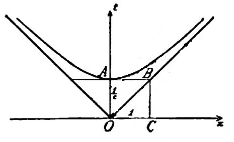 "If we now let c increase to infinity, 1/c thus converging to zero, we see from the figure described that the branch of the hyperbola always approaches closer to the x-axis, and the angle between the asymptotes widens into a straight angle."