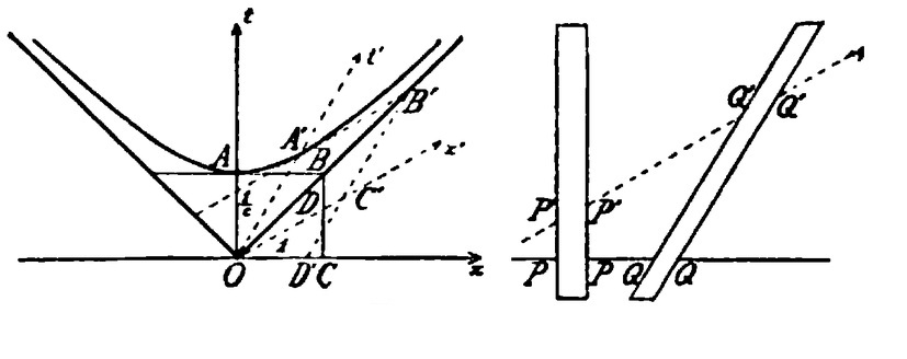 "We now assume that the first body conceived as at rest has the length l, that is, the cross-section PP of the first strip on the x-axis = l × OC, where OC denotes the unit on the x=axis ; and on the other hand that the second body conceived as at rest has the same length l, that is, the cross-section of the second strip, measured parallel to the x′-axis gives the equation Q′Q′ = l × OC′."
