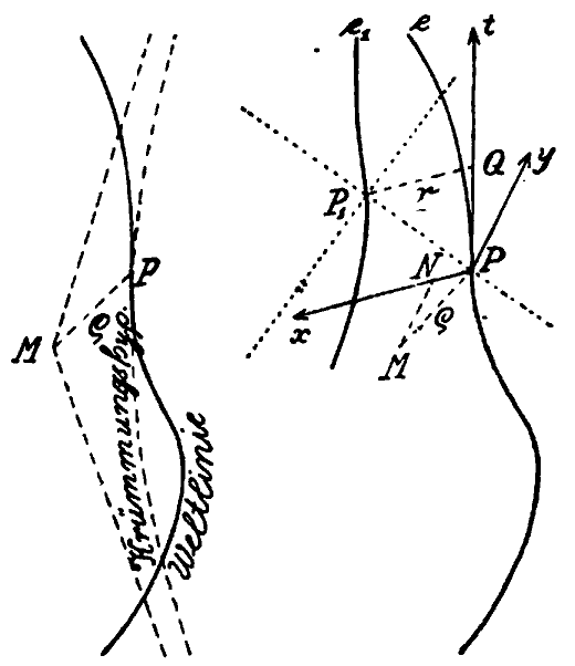 "We construct [PQ]the tangent at P to the world-line and through P1 the normal P 1Q to this tangent. Let the scalar [magnitude] of P1Q be r. Then, according to the definition of a past cone we must take the scalar value of PQ as r/c.