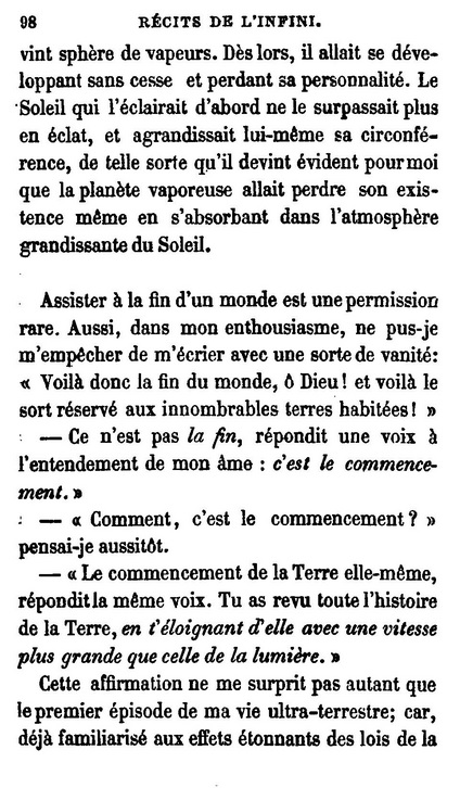 Trotter's effort aside, there are several literary treatments of the underlying conceit, works in which time unspools before a distant observer. Among the most elegant is the prose-poem "Lumen" by the astronomer-visionary Camille Flammarion in his Récits de l'infini [Paris: Didier, 1873] (English translation Stories of Infinity [Boston: Brown, 1873]) -- science fiction, but of a type completely different in tone and content from that of his contemporary Jules Verne. Flammarion's dream-like tales will be the subject of a future blog-entry here, but they share little beyond their subject with "Time Turned Back".