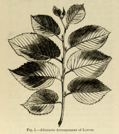 A very common arrangement is that which is called alternate (Fig. 1), in which the leaves stand singly on the nodes. Some common plants are examples, as the poplar, the oak, the apple, &c.