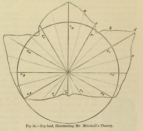 Taking an outline of a leaf, he selects a point 1/4 of the mid-rib from the base, and from that he draws radii vectores to the outline, corresponding to equal arcs, into which a circle described round the pole or point is divided. On each side of these primary radii others are drawn at equal distances, and each measured by a scale of equal parts : the accompanying diagram (Fig. 10) of an ivy-leaf will illustrate the method.