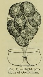 Attention may now be directed to the number 4, or a multiple of it in some of the lower forms of plants. The instances are so numerous that a few examples may suffice. It is also worthy of notice that division of protoplasm into two is not uncommon. This is well illustrated in the development of the reproductive spores, as they are called. The gills of mushrooms are covered with numerous club-shaped cells --- sporophores or spore-bearers --- on the summit of which the spores are in groups of 4. In others, such as the well-known mushroom called the morell, there are eight spores in an oblong case or cell. In one of our most common sea-weeds, the Fucus vesiculosus, or bladder fucus, so-called from numerous air-vesicles on it, the contents of oogonium divide into eight portions (Fig. 11).