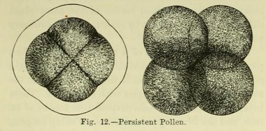 This is also illustrated in the development of the grains of the dust-like pollen, which is shaken out of the flowers of the higher plants, or those which have obvious flowers. This is well seen in the earlier stages of the pollen in mallow. After the four very young grains escape from the mother-cell and are free, they increase in size, and the surface becomes rough with projecting points. In some cases the grains, after escaping from the parent cell, even when mature, remain bound together, giving, thus, composite pollen. This occurs in species of typha (cat's-tail) or bullrush. An early stage of the pollen thus remains persistent (Fig. 12).