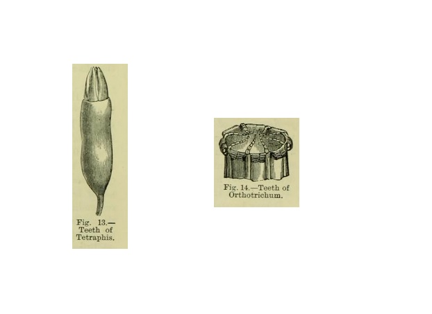 The numbers of these teeth, when present, are 4, or some power of 4 up to 64, being 4 in tetraphis (Fig. 1 3) ; 8 apparently in some species of orthotrichum (Fig. 14); 16 in grimmia and others ; in zygodon, the outer teeth are considered to be of 32 primary divisions, united 2 or 4 together, so as to represent 16 or 8 plain teeth. In polytrichum there are 64 (rarely 32) teeth. Where there are two rows of teeth, which is a frequent character, the law also prevails, and those of the one row alternate with those of the other.