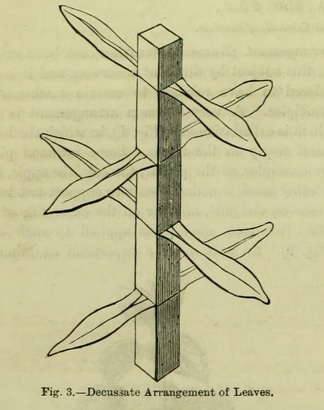 It is, however, worthy of notice that usually the pairs of opposite leaves alternate with each other --- that is to say, if we place the stem before us, and observe a pair of leaves one on the right, the other on the left, the next pair will stand one in front and the other behind ; the successive pairs of leaves are then described as decussate (Fig. 3), but even this may not be strictly true, and several pairs of leaves may intervene between those which are properly at right angles to each other.