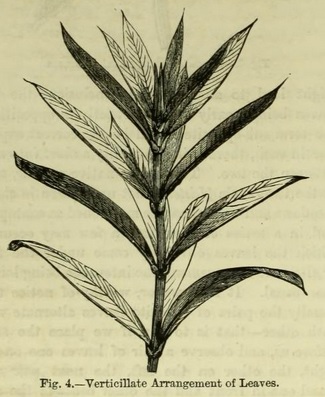 Take, again, the common bed-straw (Galium), or madder, and we find the leaves arranged after what is known as the verticillate, or whorled manner (Fig. 4). Here we find that more than two leaves appear to come from the same transverse zone, or node. In these cases also we find alternation of leaves in the successive whorls --- that is, each leaf usually stands opposite the spaces between the leaves of the next whorl.