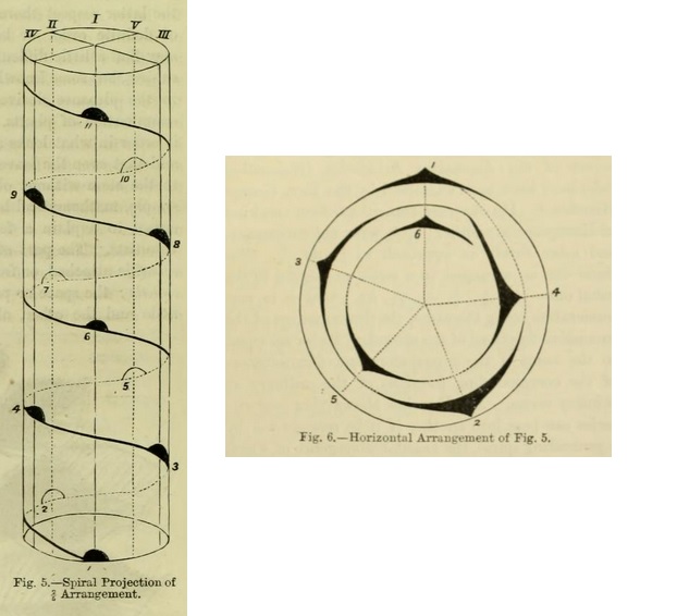 In many plants --- such as the apple, peach, cherry, poplar, &c. --- the leaves present a five-ranked arrangement. Beginning with one leaf, two circuits round the stem are necessary before reaching the leaf directly above the one from which the line began. The fraction "2/5" is used to indicate this --- that is to say, two turns round the stem, and the sixth leaf directly above the first ; therefore 5 leaves in the cycle. Figs. 5 and 6 show a spiral and horizontal projection of a 2/5 arrangement.