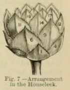 The more simple arrangements are of frequent occurence ; where the internodes are very short, the leaves are crowded, and the analysis of such cases is more difficult, as in the rosettes presented by the leaves of some sedums or stonecrops, and of sempervivum or houseleek (Fig. 7, showing 5/13 arrangement), and the cones of firs.