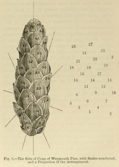 Most fir-cones have such arrangements as are expressed by the ordinary terms, 1/2, 1/3, 2/5, 3/8, 5/13, &c., whose generating and successive secondary spirals are shown by the numbers 1, 2, 3, 5, 8, 13, &c. ; but cases occur in which there are either conjugate spirals of the ordinary system, or there are arrangements which may be referred to other systems of spirals. The more common exceptions are bijugates of the usual system, and therefore represented by the numbers 2, 4, 6, 10, 16, 26, &c. ; and simple spirals of the system 1/3, 1/4, 2/7, 3/11, 5/18, &c., giving the numbers 1, 3, 4, 7, 11, 18, &c. Rarer exceptions are trijugates of the ordinary system, giving the numbers 3, 6, 9, 15, 24, 39, &c., or spirals of the system 1/4, 1/5, 2/9, 3/14, 5/23, 8/37, giving the numbers 1, 4, 5, 9, 14, 23, 37, &c. [I have corrected numbers printed incorrectly in original.]