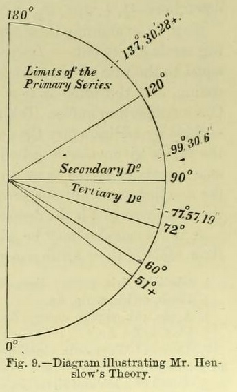 Mr. Henslow shows by a diagram (Fig. 9) that "the angular distances included by the limiting positions of the second leaves of all generating spirals, commencing at 0, decrease according as the spirals belong to the secondary, tertiary, or quaternary series ; so also does the number of leaves in a single coil increase correspondingly ; and, therefore, the higher the series, the more nearly does any spiral belonging to it approach the verticillate condition, provided the internodes be but slightly developed."