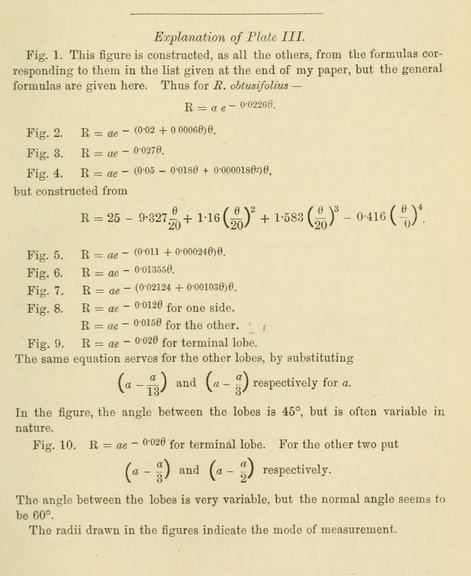 In his second paper ( On Equations to the Curved Outlines of the Leaves of Plants by William Mitchell [Transactions of the Botanical Society of Edinburgh 10, 288 (1870)]) Mr. Mitchell treats of equations to the curved outlines of the leaves of plants. He proposes to find formulas to express the curves of the outlines of leaves, so that the calculated values should not differ from the measured, more than the proportional measurements of several leaves of the same plant differ among themselves, by reason of their ordinary variations.