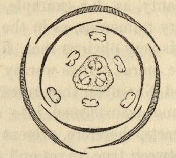 As an example of the three-ranked arrangement in the monocotyledonous division, we may take the flower of a hyacinth ; we observe on the outside 3 parts, or "sepals" as they are called, forming the "calyx" or cup. More internally, we see other 3 --- the petals --- the corolla, or coloured part of the flower. Next we find 6 "stamens" in two rows, an outer and inner, and in the centre of the flower a seed-vessel of 3 pieces conjoined; all these alternate with each other. The same succession of parts may be observed in complete flowers of dicotyledons, the numbers in each whorl being, however, mostly 4 or 5, although there are exceptions to this.