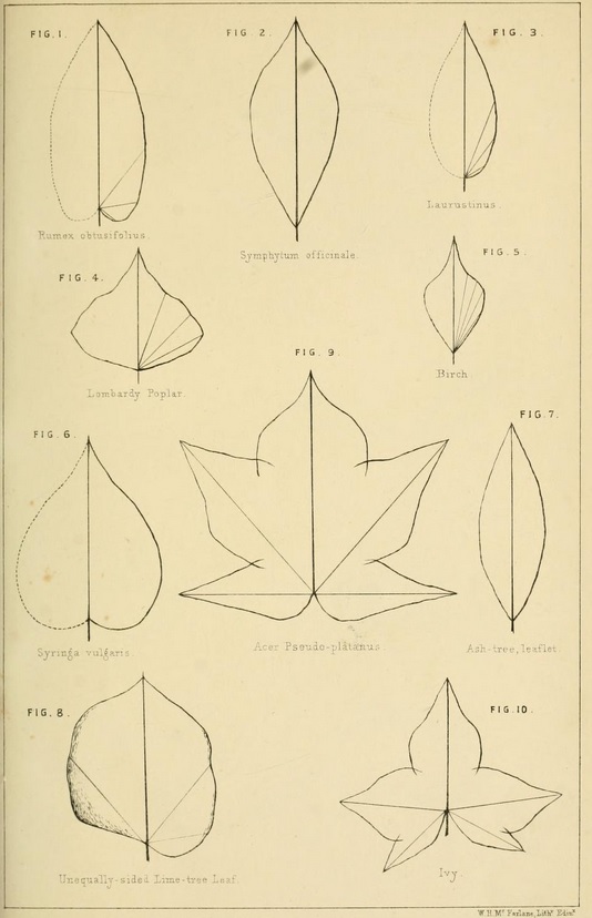 He traces the outline of a well-developed leaf on paper. The base of the mid-rib is taken as the origin of measurement, and from it lines are drawn to the margin, making equal angles with each other. These being measured by a scale divided into tenths of an inch, and the first line or radius vector being longest, we have a descending series of terms from which to construct a formula for the curve in question, in simple, undivided leaves. Little modification is necessary to the more regularly divided leaves, and to compound leaves. In the 5-lobed leaf of maple, the radiating vein of each lobe may be compared to the mid-rib of a single leaf, and a formula found for 3 out of the 5. The intersections of the curves will produce the outline of the simple divided leaf, when set off on 5 axes, making usually an angle of 45° with each other.
