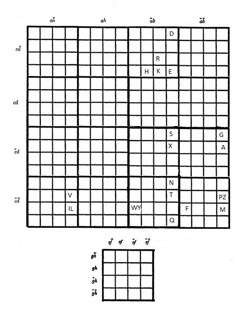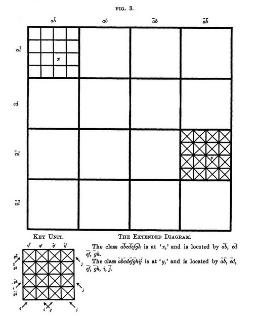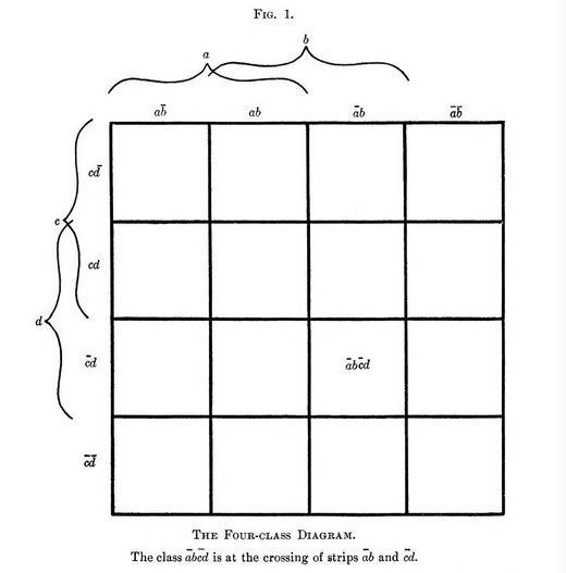 It will be found a practical advantage for very complex cases to use, for each four-class set, a typical unit as a key, on which its particular four-class notation is marked, rather than to confuse the primary square by a superabundance of class terms; and also on account of the fact that by the use of such a key the actual construction of the complete diagram need be carried out in extreme detail in those portions only to which the conditions of the problem under discussion apply.