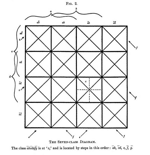 The diagram of Dr. H. Marquand [Philosophical Magazine V 12, 266 (1881)] comes nearest to satisfying all the conditions ; there is no question as to its extensibility and its perfect correspondence ; but it has the disadvantage that the elements of a single class are in discrete groups, even in the simplest possible cases, and this involves unnecessary complexity.
