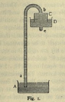 One of the constructions of the old gentleman I remember very distinctly. It may be easily understood as presented in Fig. 1. A siphon ab dips into the vessel A and at the other end with a bell-shaped expansion C into the vessel D. If the openings a and e are left unobstructed then, according to the expectation of the inventor, the small mass of water in the tube ab would follow the large masses of C and D and flow out at e. Instead of this, Cba behaved like a normal siphon flowing in the direction indicated by the letters, whereas a part of the water in D, to be sure, descended through e so that a break occurred between the water in C and in D, whereat the arrangement had failed to perform its function.