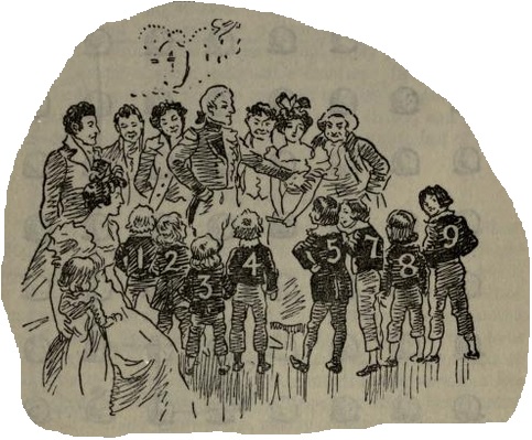 "We laughed greatly at a pretty jest on the part of Major Trenchard, a merry friend of the Squire's. With a piece of chalk he marked a different number on the backs of eight lads who were at the party." Then, it seems, he divided them in two groups, as shown in the illustration, 1, 2, 3, 4 being on one side, and 5, 7, 8, 9 on the other. It will be seen that the numbers of the left-hand group add up to 10, while the numbers in the other group add up to 29. The Major's puzzle was to rearrange the eight boys in two new groups, so that the four numbers in each group should add up alike. The Squire's niece asked if the 5 should not be a 6 ; but the Major explained that the numbers were quite correct if properly regarded,