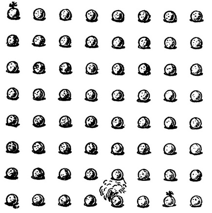 I fail to fully understand this fanciful and rather overstrained view of the puzzle. But it would appear that the puddings were arranged regularly, as I have shown them in the illustration, and that to strike out a pudding was to indicate that it had been duly tasted. You have simply to put the point of your pencil on the pudding in the top corner, bearing a sprig of holly, and strike out all the sixty-four puddings through their centres in twenty-one straight strokes. You can go up or down or horizontally, but not diagonally or obliquely; and you must never strike out a pudding twice, as that would imply a second and unnecessary tasting of those indigestible dainties. But the peculiar part of the thing is that you are required to taste the pudding that is seen steaming hot at the end of your tenth stroke, and to taste the one decked with holly in the bottom row the very last of all.