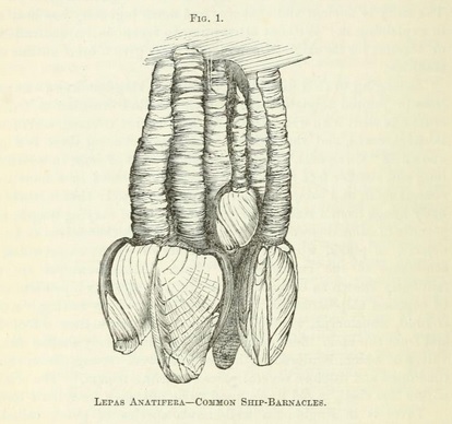 Belonging to that division of the animal kingdom known as articulates or jointed animals, there is a class called crustaceans, from the crust-like shell with which the body and legs are covered, and of which lobsters, crabs, and shrimps are examples. Among these is a group known as "Cirripedia," from the cirri, or curls of hair, in which their long and slender feet terminate. They are inclosed in a more or less conical shell, and some of them are "pedunculated" ; that is, their main body hangs from a stalk, pedicle, or peduncle, of varying length, which permits of some degree of motion. They attach themselves to floating objects, as plank, worm-eaten fragments of wreck, ships' sides, and sometimes to the cuticle of the whale. These creatures are more familiarly known as barnacles, and Fig. 1 represents a pendent group of common ship-barnacles, which are described as having "a flesh-colored, translucent, wrinkled stem, possibly more than a foot long, and from this stem there dangles a triangular, pearly-shelled fish, the valves of which, bordered with the most lovely orange, from time to time open and disclose several pairs of curling feelers."