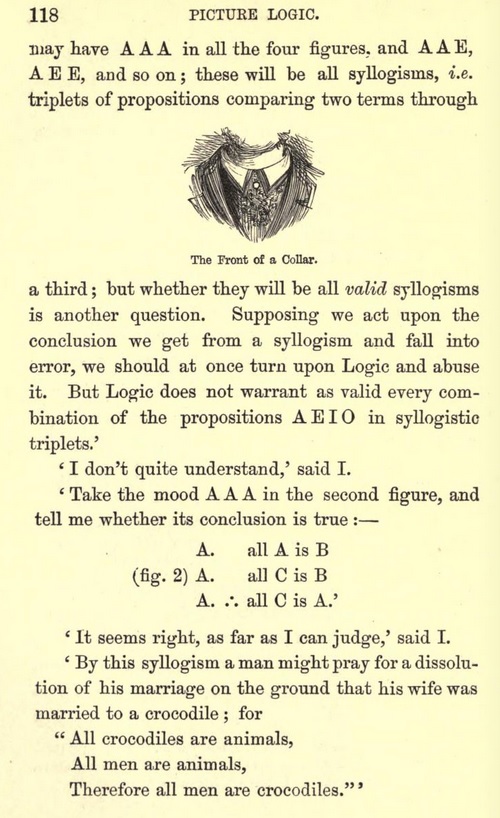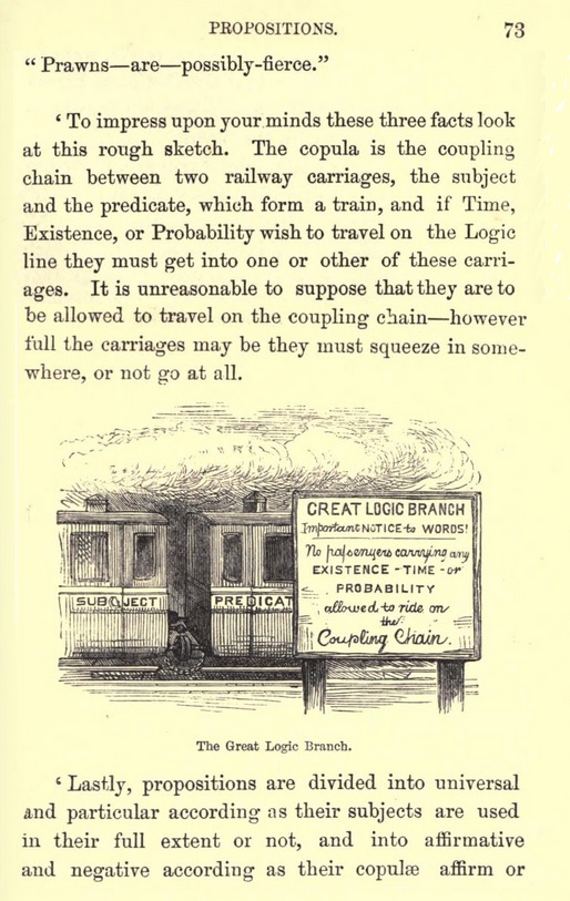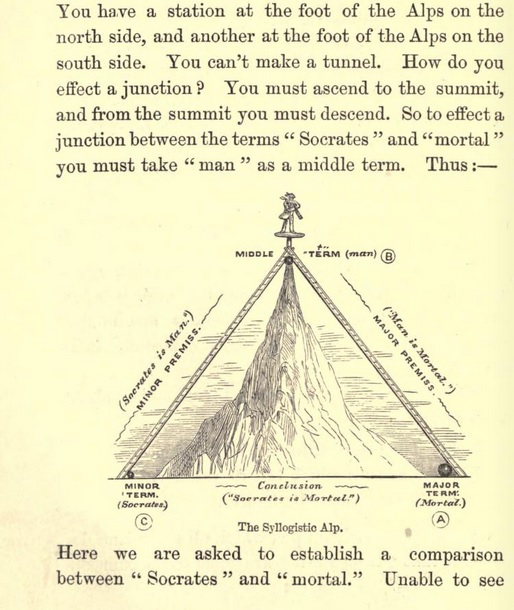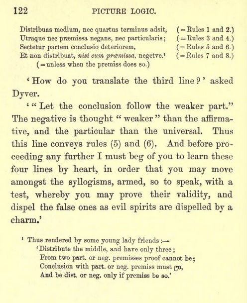 "Innovative" pædagogy is rarely innovative; higher education in some form has existed for thousands of years, and almost everything has been tried. Even during the Nineteenth Century, when most textbooks featured self-consciously dry prose set in long columns of grey type unbroken by graphics, there were outliers using techniques associated with other eras. Formal logic especially seemed to inspire such deviations. Lewis Carroll is the best-known of the logician-humourists, but his writings conveyed original ideas rather than the standard curriculum. By contrast, Picture Logic was entirely conventional in content, aimed at the student market. (This does not imply, however, that it was not up-to-date; logic was a fast-evolving field in the 1800s, and Swinburne's text covers such recent developments as the Venn diagram.) The constant use of visuals and jokes makes Picture Logic fit well with Twenty-first Century educational practice, and indeed (if one can tolerate some regretable sexist and imperialist passages, and if one has a Nineteenth Century schoolboy's knowledge of Latin and Greek) one might be hard-pressed to find a better introduction to classical logic.