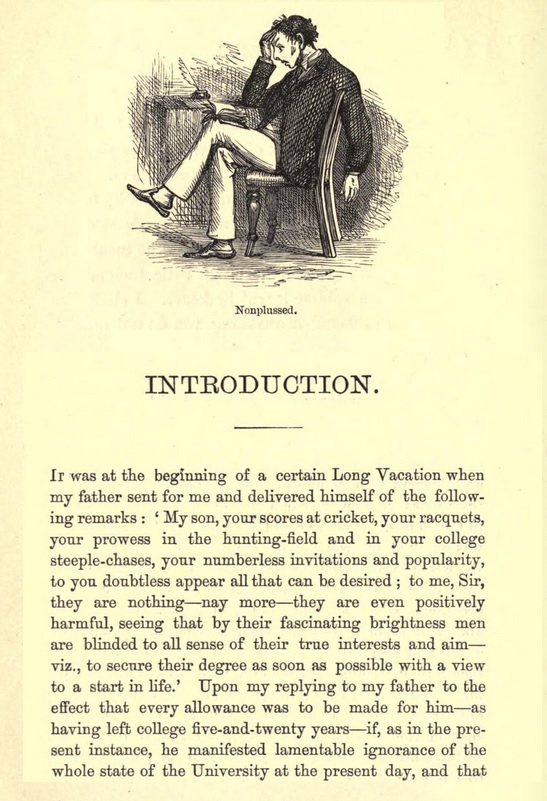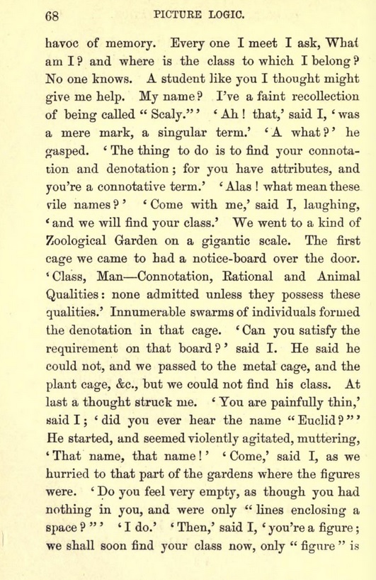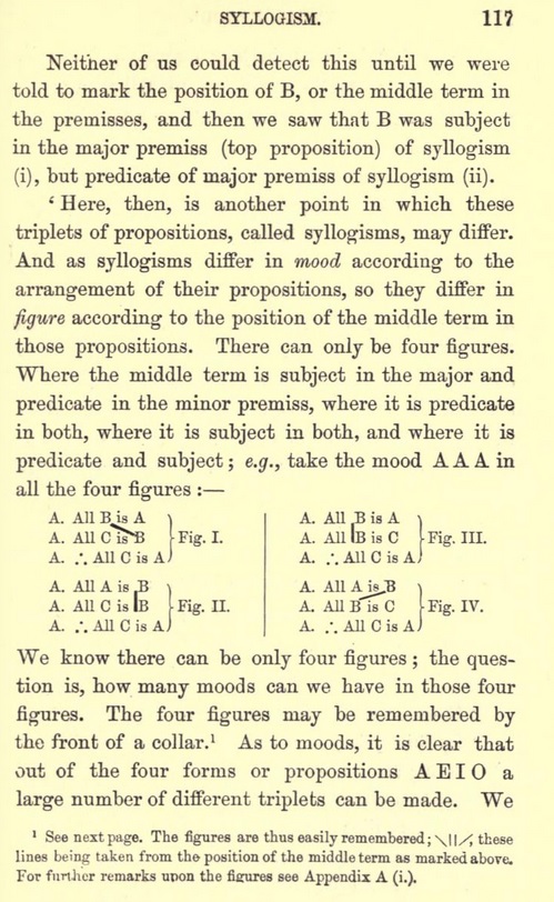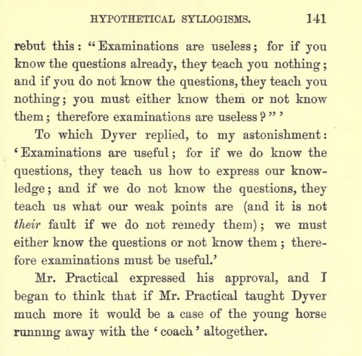 "Next morning Mr. Practical assumed a grave look and began : There is no lack of treatises on Logic, but there is a lack of people who understand them. It is the custom of Passmen to attempt to learn by heart a great deal of matter they do not in the least comprehend, without attempting to realise the meaning, and so fixing it in the memory. A little understood is better than a volume learnt by heart. I shall not expect you to remember anything you do not understand ; nor shall I ever make use of instances other than those of everyday life ; and if my illustrations be too familiar to appear scientific, my excuse will be that I wish to bring home to you what I say, that you may realise and appreciate and so remember its meaning, as a man who has swum two miles, or been ill eight hours on a boat, has no difficulty in remembering the force of the expressions long swim or unpleasant cruise. The neat and concise phrases you meet with in your treatises on Logic are deceptive ; like the ease of a good skater or runner, they are the results of hard work, and you might as well expect to get that ease at once without practice, as imagine that by learning off those phrases you have mastered Logic. Therefore, pass over all words and instances that you do not understand as you read your treatises side by side with my attempts at explanation."