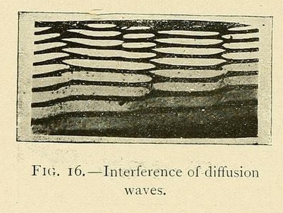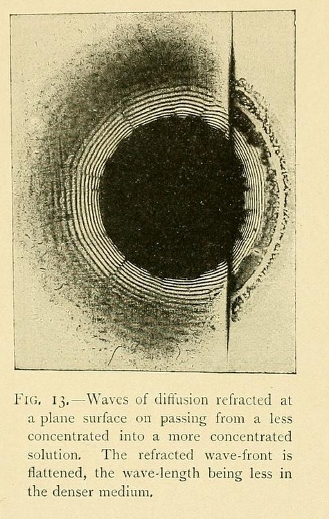 The rings in the figure are layers of silver arsenate precipitated when a drop of silver nitrate falls on a hot glass plate covered with a thin layer of gelatin solution containing sodium arsenate. Leduc extended these "optical" experiments to include the interference patterns created when a series of drops are "sown" in a straight line across the plate: