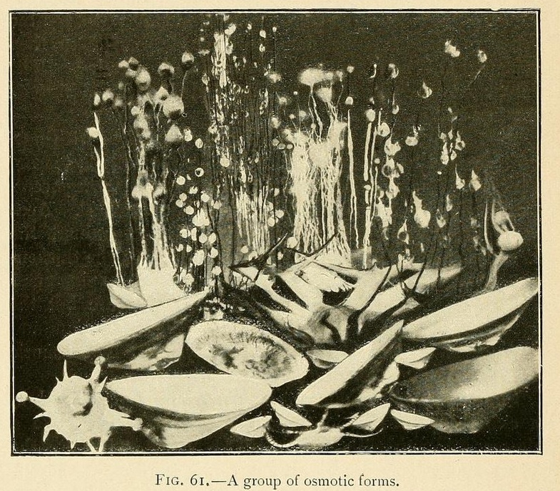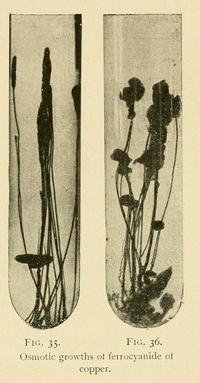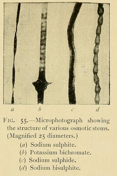 Precipitated osmotic membranes are very widely distributed in nature. Professor Ulenhuth has seen iron growths in alkaline sodium hypochlorite (Javelle water), and Lecha-Marzo has demonstrated the osmotic growth of the various stains used for microscopy, in the liquids used for fixing preparations.