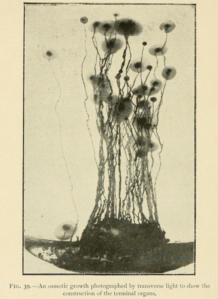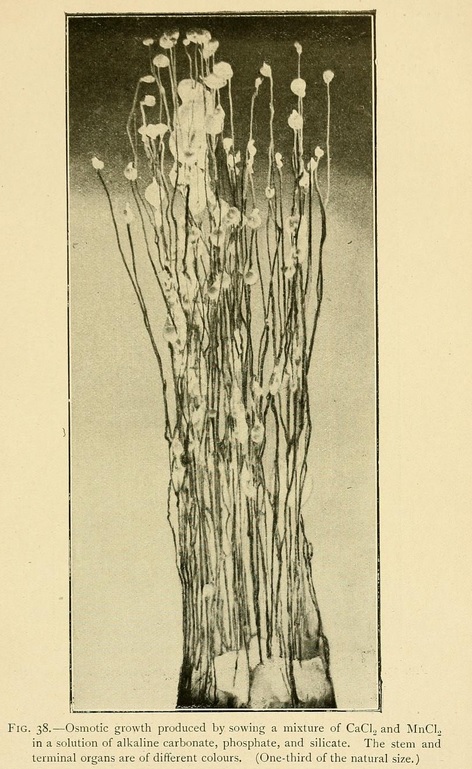 Osmotic Growths. --- If we sow fragments of calcium chloride in solutions of the alkaline carbonates, phosphates, or silicates, we obtain a wonderful variety of filiform and linear growths which may attain to a 30 or 40 centimetres. Some are so flexible that the stems bend, falling in curves around the centre of growth, like leaves of grass. If we dilute this same liquid, as it becomes less concentrated the growths are more curved, ramified, dendritic, like those of trees or corals.