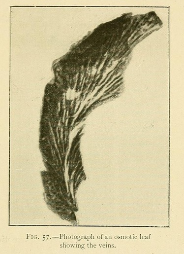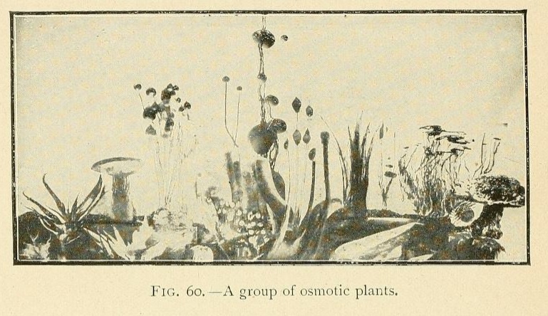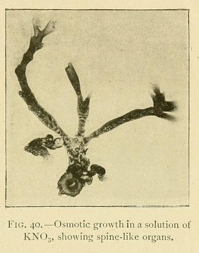 In this solution we can obtain osmotic growths which may attain to a height of 40 centimetres or more, vegetable forms, roots, arborescent twigs, leaves, and terminal organs. These growths are stable as soon as the gelatine has cooled and set, and may be carried about without fear of injury (Fig. 35).