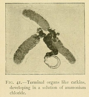 In the culture of osmotic growths we may also by appropriate means produce terminal organs resembling flowers and seed-capsules. To do this we wait till the growth is considerably advanced, and then add a large quantity of liquid to the nutrient solution so as to diminish the concentration a hundredfold or more. Spherical terminal organs will then grow out from the ends of the stems, which may during their further growth become conical or piriform in shape.
