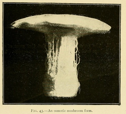 The preponderating influence in morphogenesis is osmotic pressure, the osmotic forms varying with its intensity, distribution, and mode of application. Whatever the chemical composition of the liquid, similar osmotic forces, modified in the same manner, give rise to forms which have a family resemblance. The chemical nature of the liquid, however, is not entirely without influence on the form. Thus the presence of a nitrate in the mother liquor tends to produce points or thorns: