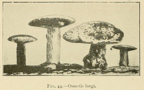 The stem of these osmotic fungi is formed of bundles of fine hollow fibres, while the upper surface of the cap is sometimes smooth, and sometimes covered with small scales. The lower surface of the cap shows traces of radiating lamellæ, which are sometimes intersected by concentric layers parallel to the outer surface of the cap. In this case the lower surface of the cap shows a number of orifices or canals similar to those seen in many varieties of fungus.