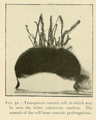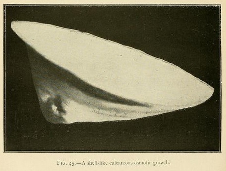 Most beautiful osmotic cells may be produced by dropping a fragment of fused calcium chloride into a saturated solution of potassium carbonate or tribasic potassium phosphate, the calcium chloride becoming surrounded by an osmotic membrane of calcium carbonate or calcium phosphate. This mineral membrane is beautifully transparent and perfectly extensible. It is astonishing to contemplate the contrast between the hard crystalline forms of ordinary chalk and these soft transparent elastic membranes which have the same chemical constitution. These osmotic cells of carbonate of lime or phosphate of lime consist of a transparent membrane enclosing liquid contents and a solid nucleus of chloride of calcium. Their form is that of an ovoid or flattened sphere, and they may attain a diameter of seven centimetres or more.