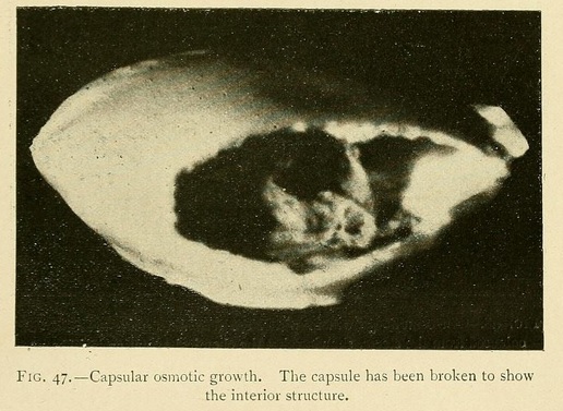 It is even possible to rejuvenate an osmotic growth that has become degenerate through age. An osmotic production grows old and dies when it has expended the osmotic force contained in the interior of its capsule. A calcium osmotic growth which has thus become exhausted may be rejuvenated by transferring it to a concentrated solution of calcium chloride. It will absorb this, and thus be enabled to renew its evolution and growth when put back again into the original mother liquor.