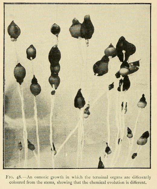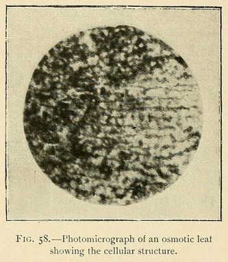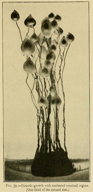 More frequently the osmotic growth consists of a number of cells instead of one large cell. The first cell gives birth to a second cell or vesicle, and this to a third, and so on, so that we finally obtain an association of microscopic cellular cavities, separated by osmotic walls -- a structure completely analogous to that which we meet with in a living organism.