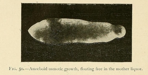 Frequently a single seed or stock will give rise to a whole series of osmotic growths. A vesicle is first produced, and then a contraction appears around the vesicle, and this contraction increases till a portion of the vesicle is cut off and swims away free like an amoeba. The same phenomenon may be observed with vermiform growths, a single seed often giving rise in this way to a whole series of amoebiform or vermiform productions.