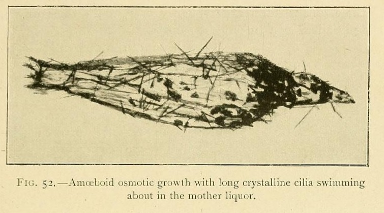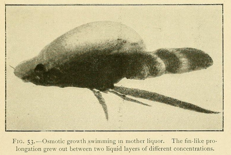 Little by little they rise up in the liquid, and finally acquire a considerable amount of mobility, being readily displaced by every current. Hence it is very difficult to photograph these mobile osmotic growths, which swim about in the mother hquor and are often provided with prolongations in the forms of cilia, and sometimes with fins, which undulate as they move.