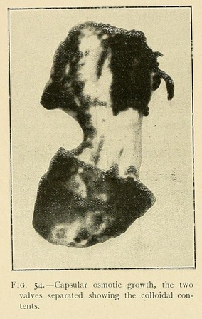 When a large capsular shell such as we have described bursts, it expels a part or the whole of its contents as a gelatinous mass which retains the form of the cavity. Similarly, if we suddenly dilute the mother liquor around an osmotic cell, it bursts by a process of dehiscence, and projects into the liquid a part of its contents, which may thus become an independent vesicle. In this way a single osmotic cell may produce a whole series of independent vesicles.
