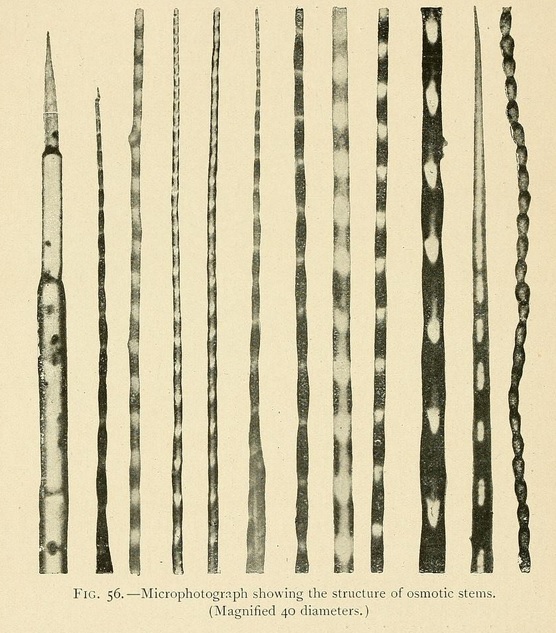 The structure of osmotic growths is no less varied than their form. Their stems are formed of cells or vesicles juxtaposed, showing cavities, separated by osmotic walls. Sometimes the component vesicles have kept their original form, so that the stem has the appearance of a row of beads. Or the cells may be more or less flattened, the divisions being widely separated. Or again, by the absorption of the divisions, a tube may be formed, a veritable vessel or canal in which liquids can circulate.