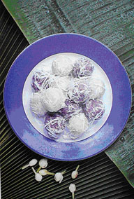 - Boil in water until the desserts float. Scoop it out and mixed the boiled ball with the grated coconut.
